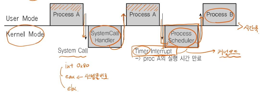 4. 해당 시스템콜 함수 실행 후(커널모드에서), 다시 커널 모드에서 사용자 모드로 변경하고, 다시 해당 프로세스 다음 코드 진행