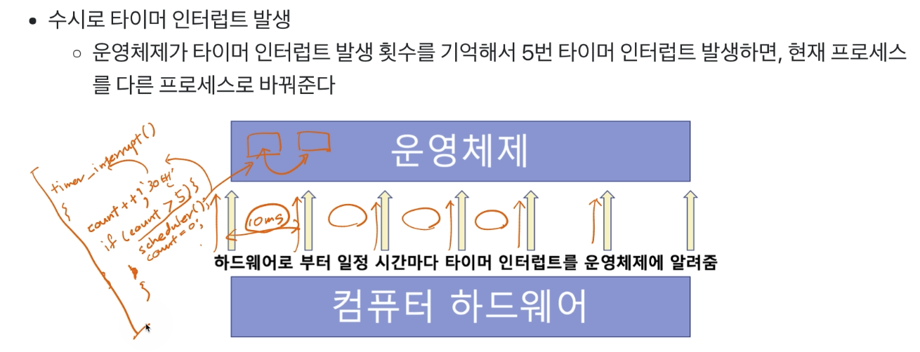 시스템 콜 실행을 위해서는 강제로 인터럽트 명령을 넣어, CPU에게 실행시켜야 합니다.