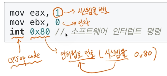 3. 소프트웨어 인터럽트 명령을 호출하면서 0x80값을 넘겨줌