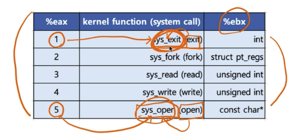 2. ebx 레지스터에는 시스템 콜에 해당하는 인자값을 넣고,