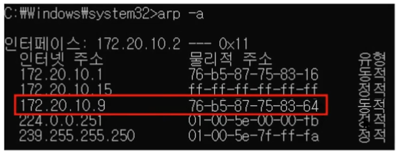 이제 보시면 arp -a를 쳤을 때, 172.20.10.9의 MAC이 보이게 되네요