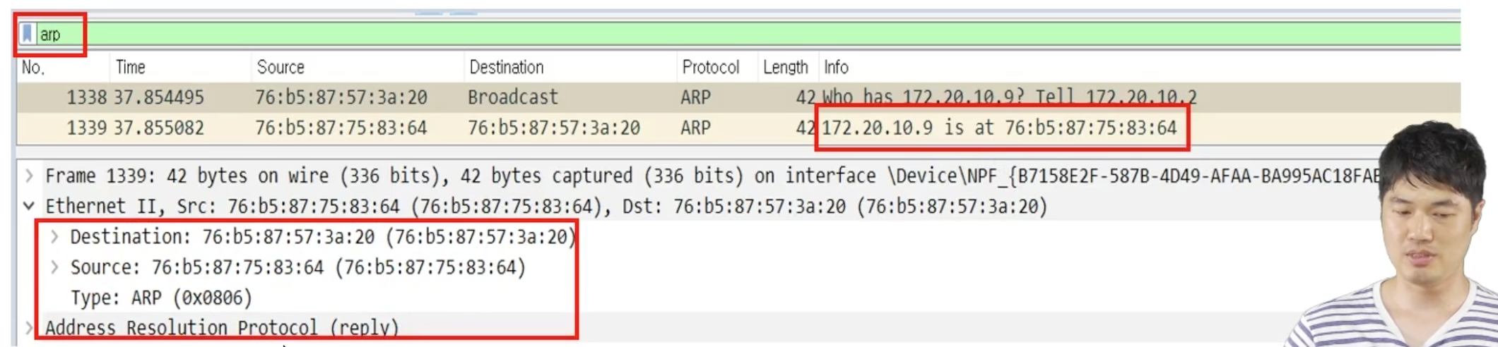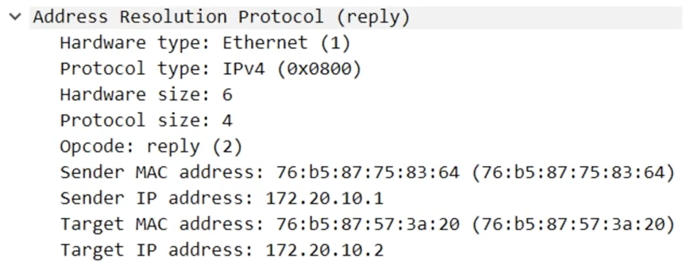 3. IP 172.20.10.9에서 목적지 MAC 주소를 ARP Reply로 전달