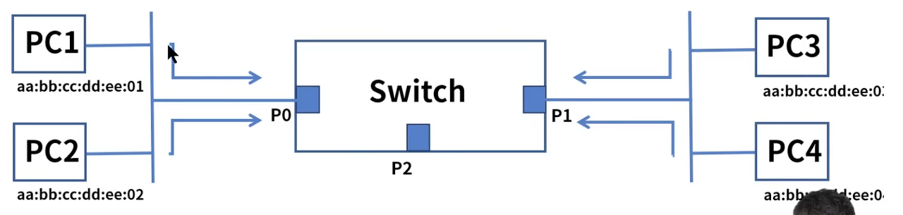 1. 4개의 PC는 스위치의 각 포트에 연결되고 프레임이 스위치에 전달