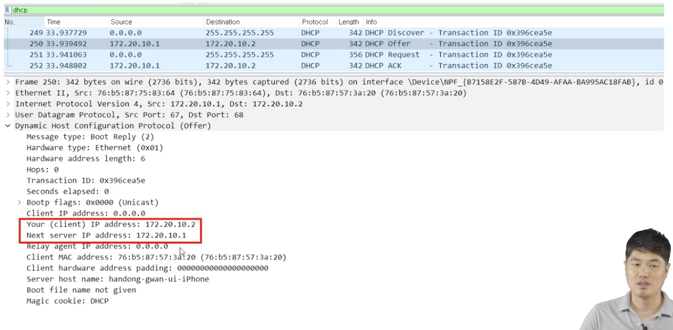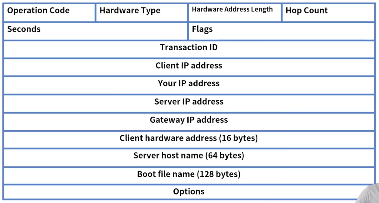 Client IP : 최초 0.0.0.0, Your IP : 할당 될 IP, Options : DHCP 메시지 타입 포함
