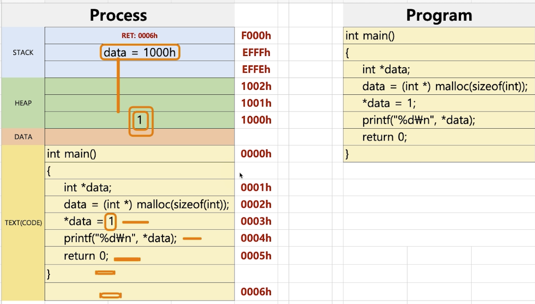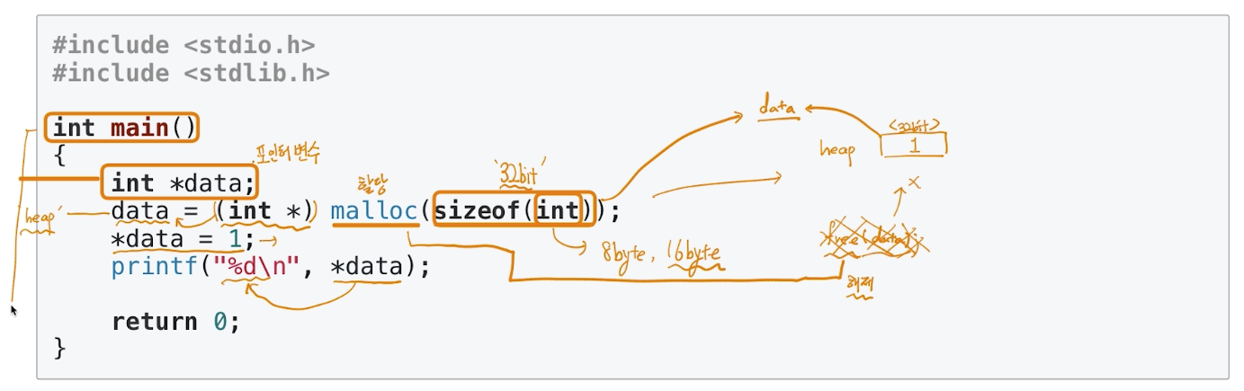 힙이라는 공간은 C언어에서는 동적 메모리를 생성하는 malloc() 함수를 통해서 만들어지는 공간이다.