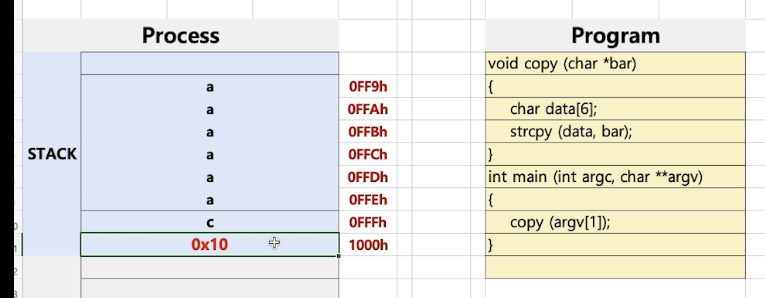 스택 오버플로우 : 주로 해커들의 공격에 활용되었음(프로세스 구조를 알고있기 때문에..해킹이 가능)