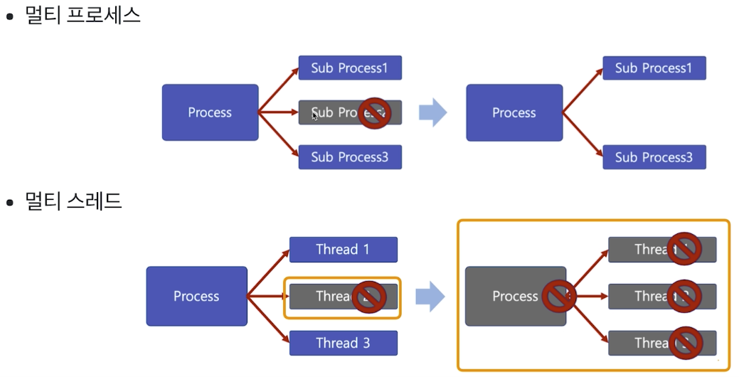 - 하나의 스레드에서 발생한 문제가, 프로세스 전반에 영향을 미침
