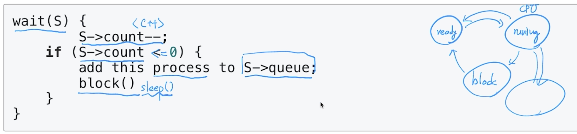 * S가 음수일 경우, 바쁜 대기 대신, 대기큐에 넣는다.