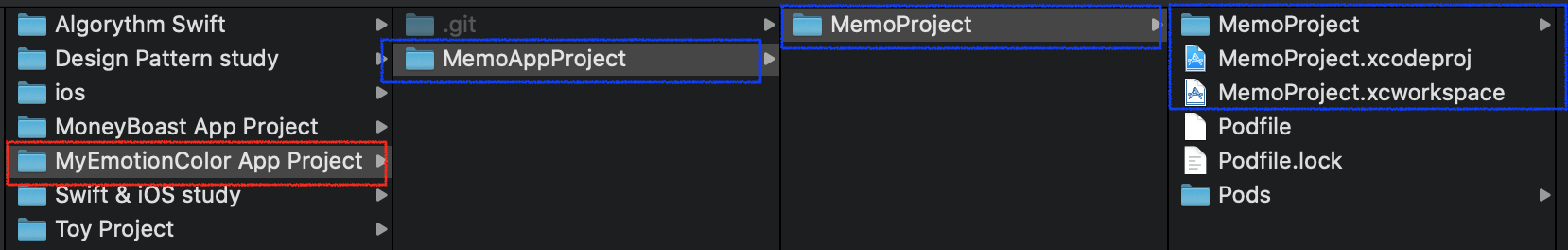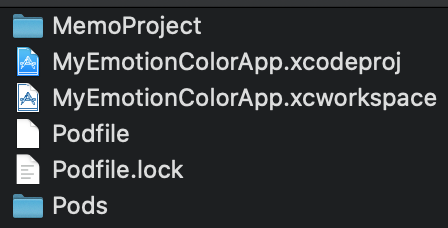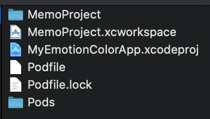 그리고 finder로 가서 ~.xcworkspace파일의 이름을 MyEmotionColorApp으로 바꿔주세요.(오른쪽이 바뀐것)