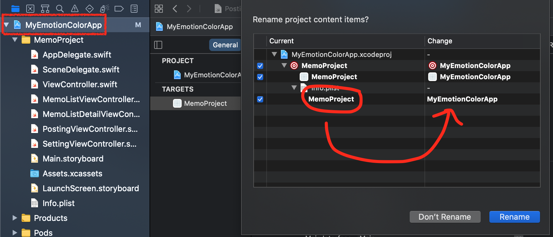 여기서 MemoProject였던 이름을 MyEmotionColorApp으로 변경해준뒤 Rename합니다.