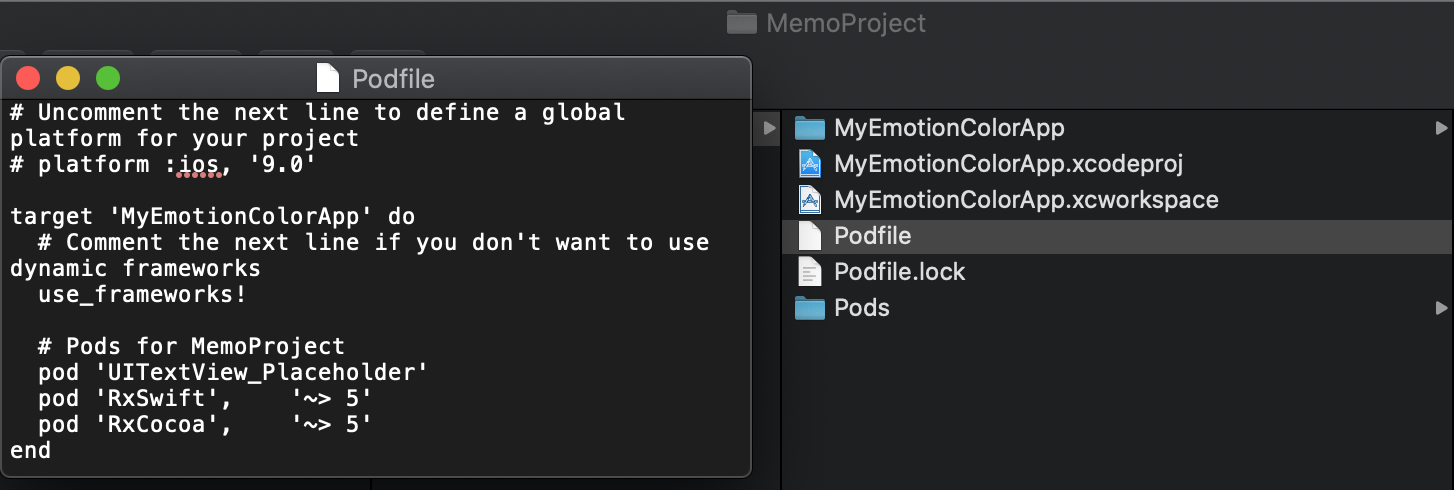 그래서 저는 finder에서 수정하려고 합니다. Podfile을 클릭하고 target을 MemoProject에서 MyEmotionColorApp으로 바꿔줍니다.