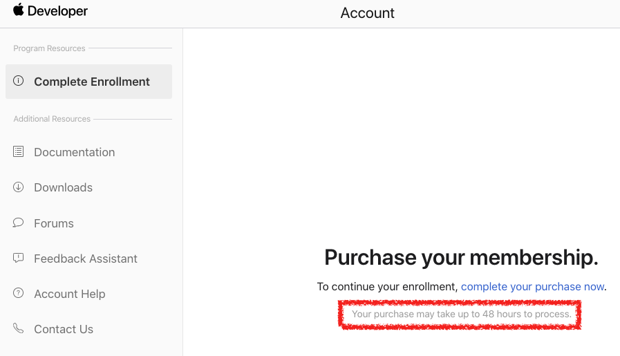 이건 내 개발자 계정 화면..음 48시간 정도 걸릴 수 있다고.. 그럼 토요일에 결제했으니 월요일엔 개발자 계정 승인 되는건가.