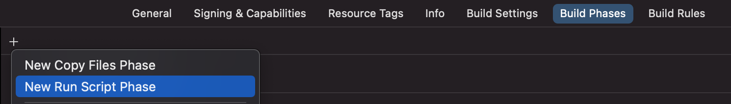 그리고 왼쪽 상단의 플러스 버튼을 클릭하고 New Run Script Phase를 눌러주세요