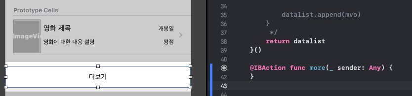 cell밑에 더보기 버튼을 추가하고 ListViewController에 more라는 액션메서드로 이어줬습니다.