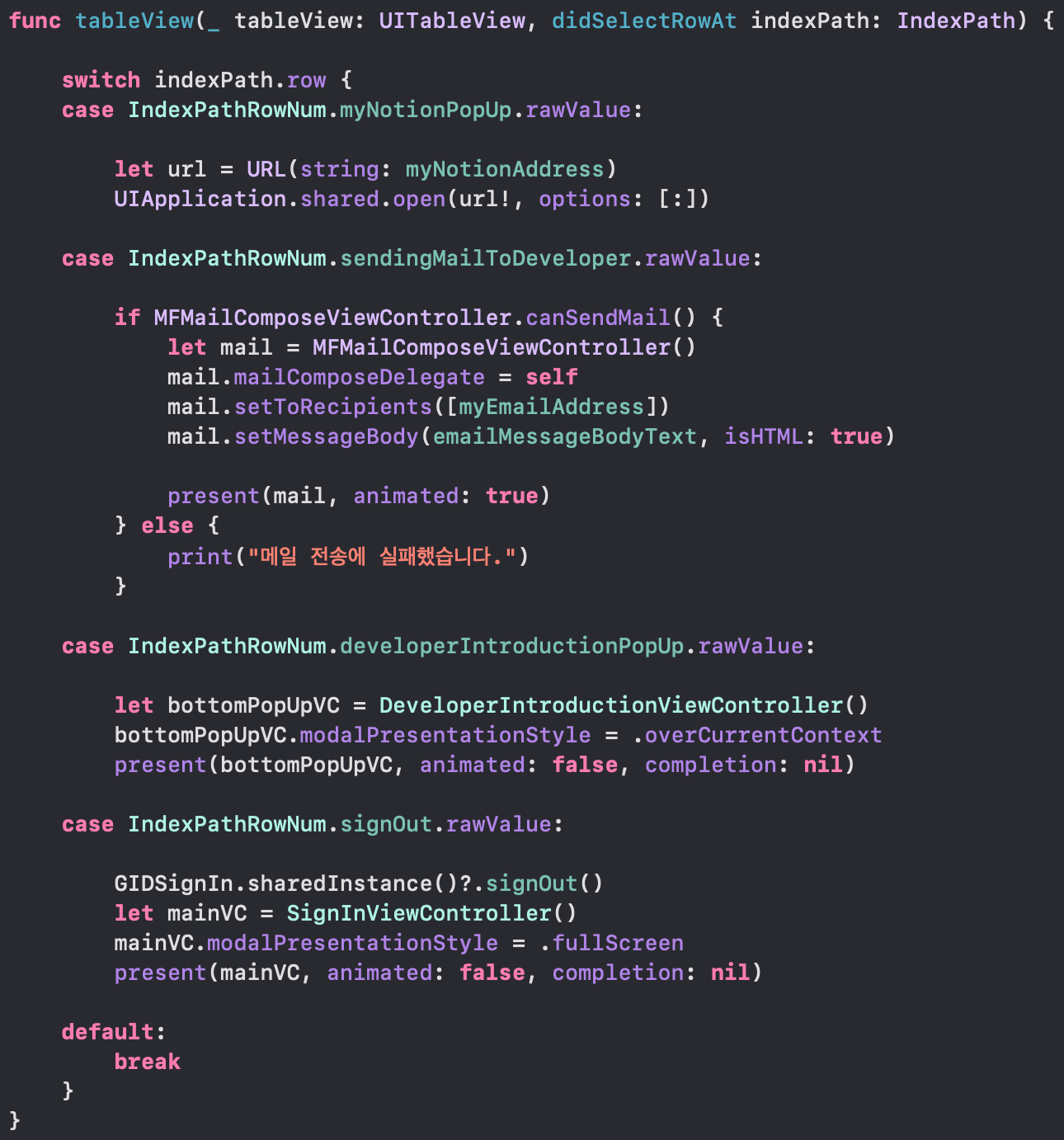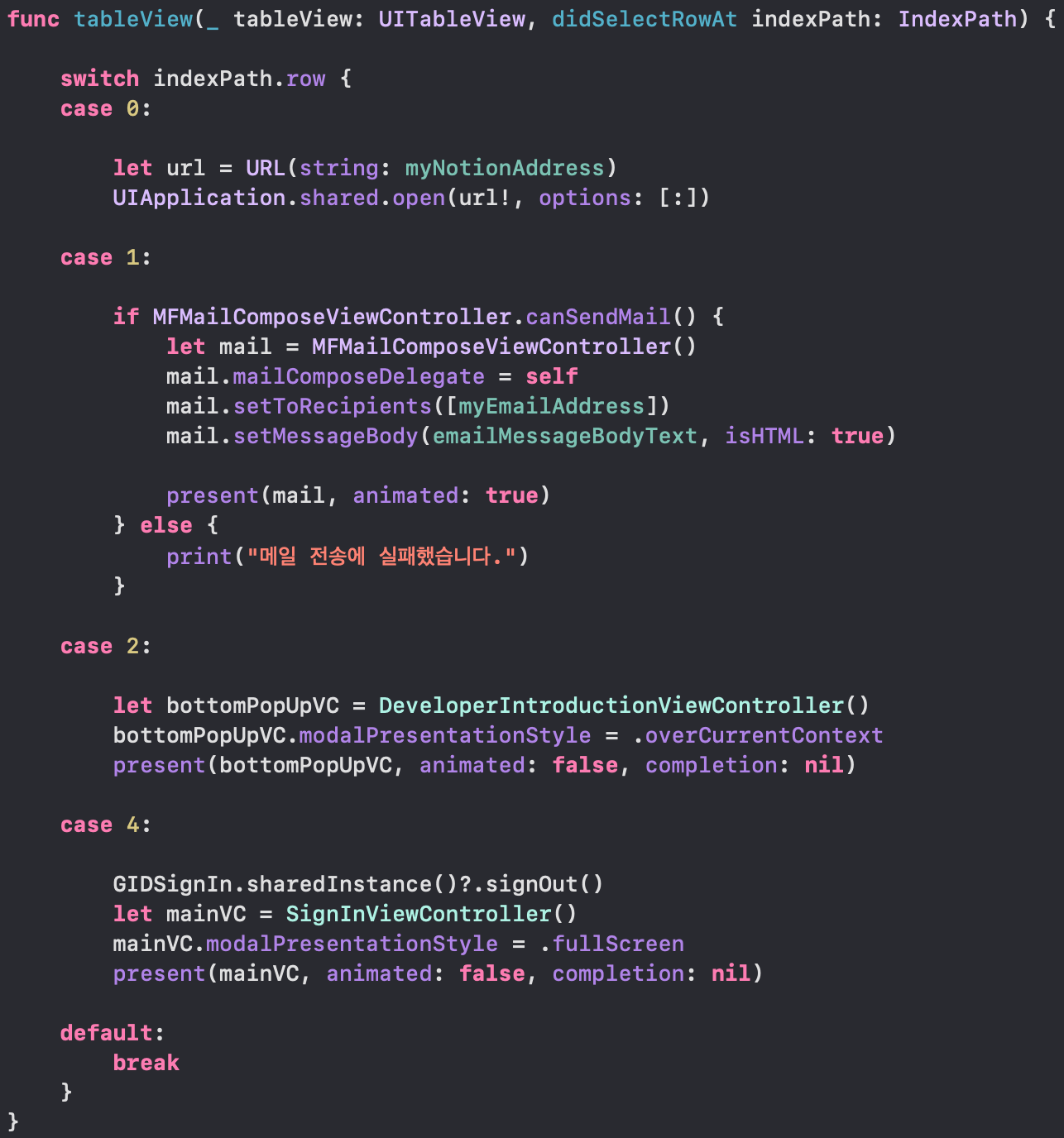 | 두번째 cell클릭시 메일보내기창 present | case 1 | case IndexPathRowNum.sendingMailToDeveloper.rawValue |