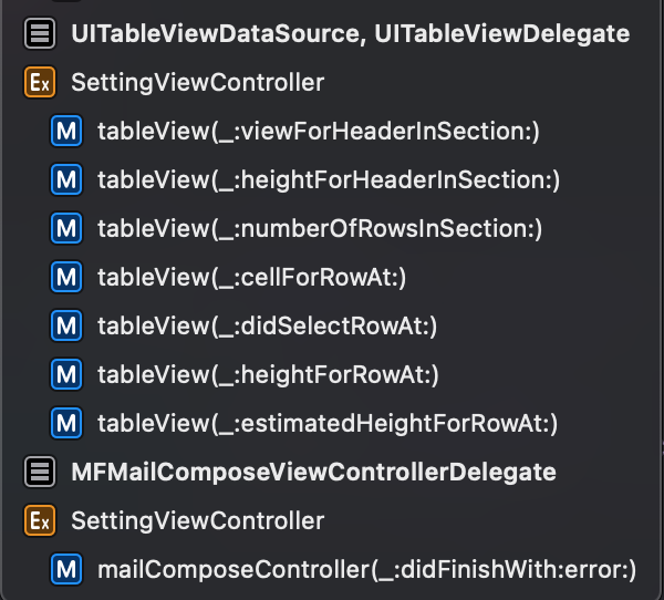 ex. SettingViewController에서 extension으로 처리한곳 위에, 채택했던 프로토콜을 Mark문법으로 적어주어 코드의 구성을 시각화함