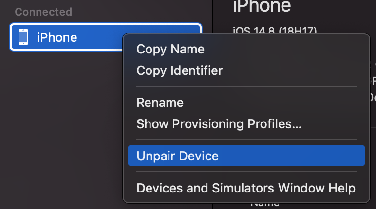 전 여기서 제 아이폰을 우클릭해서 Unpair해주었습니다.