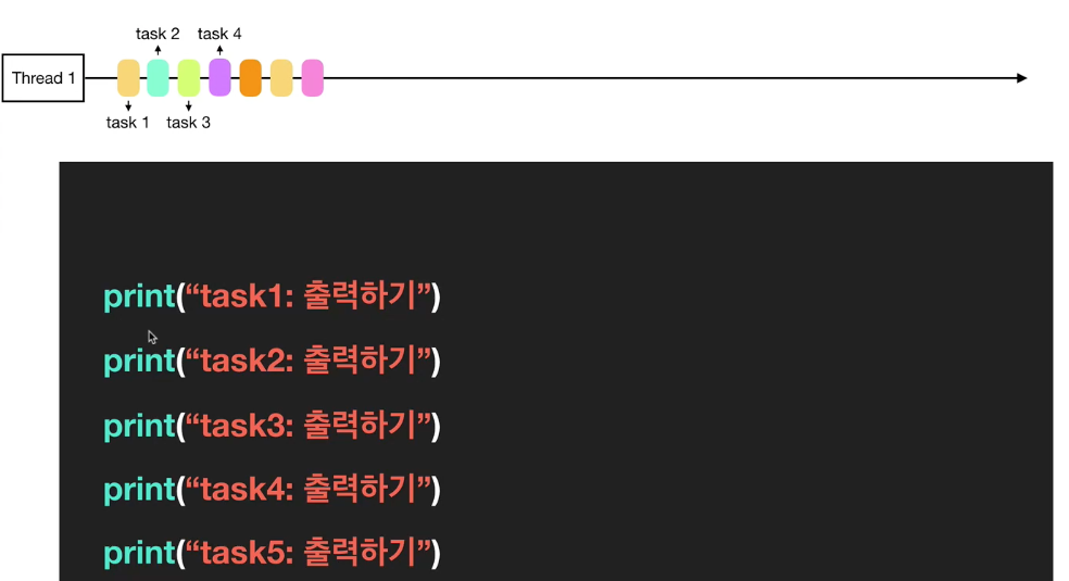사실! 아래와 같이 print만 출력하는것과 같은 간단한 코드의 경우 스레드 한개만 가지고 일을 해도 버벅이지 않을 수 있겠지만..