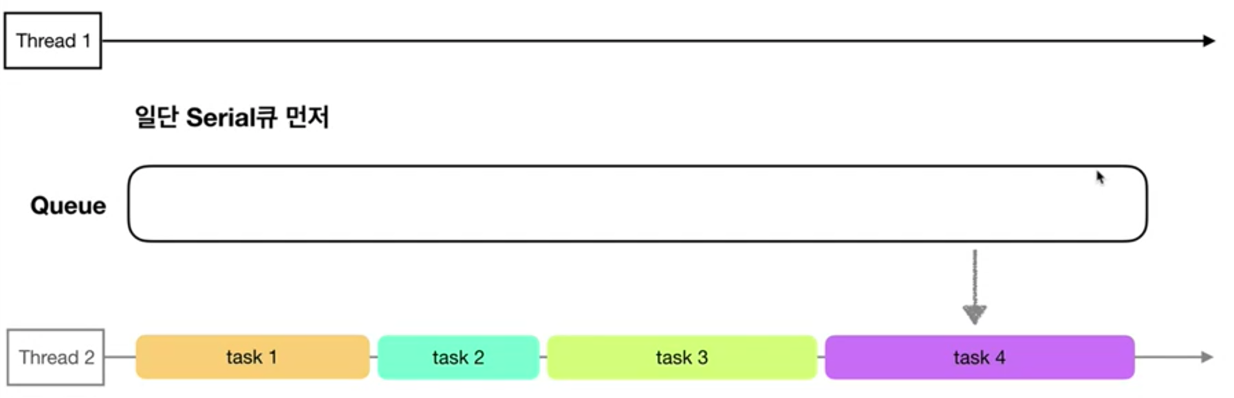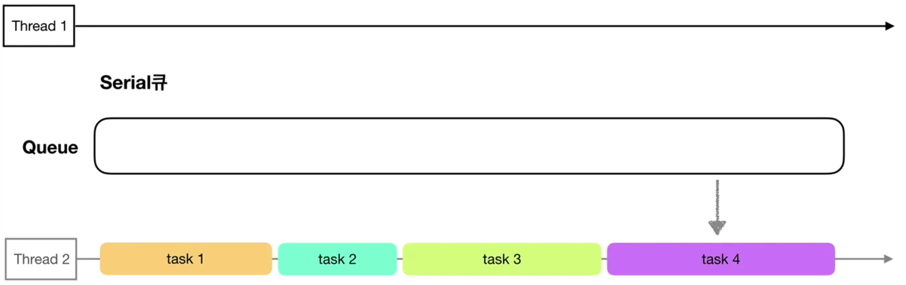 먼저 Serial직렬큐는 Queue가 받아들인 작업을 하나의 스레드로만 보내는것입니다.