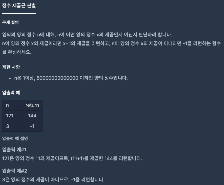 위 방식으로 제곱근 판별을 한 후 어떤 정수의 제곱근이라면 어떤 정수+1을해서 다시 제곱해주고 아니라면 -1 출력
