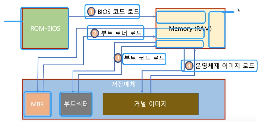 - BIOS가 특정 Storage읽어와 bootstrap loader를 메모리에 올리고 실행함
