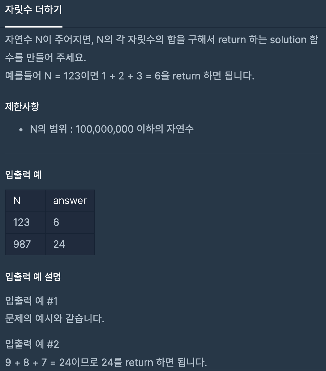 프로그래머스 1단계) 자릿수 더하기