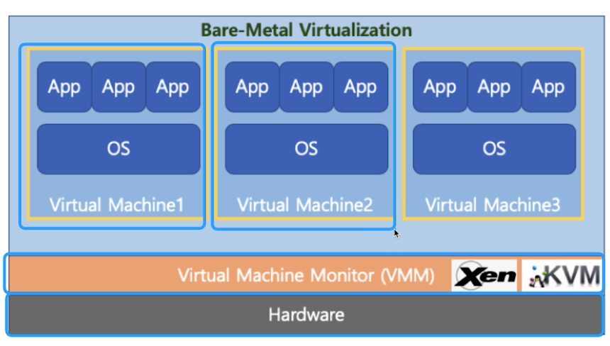 - 하이퍼바이저 또는 버추얼 머신 모니터(VMM)라고 하는 소프트웨어가 Hardware에서 직접 구동