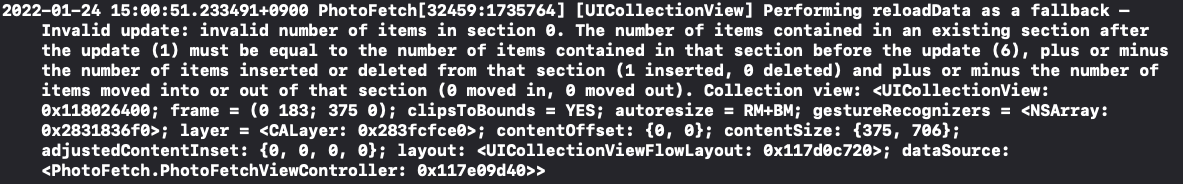 2022-01-24 15:00:51.233491+0900 PhotoFetch[32459:1735764] [UICollectionView] Performing reloadData as a fallback — Invalid update: invalid number of items in section 0. The number of items contained in an existing section after the update (1) must be equal to the number of items contained in that section before the update (6), plus or minus the number of items inserted or deleted from that section (1 inserted, 0 deleted) and plus or minus the number of items moved into or out of that section (0 moved in, 0 moved out). Collection view: <UICollectionView: 0x118026400; frame = (0 183; 375 0); clipsToBounds = YES; autoresize = RM+BM; gestureRecognizers = <NSArray: 0x2831836f0>; layer = <CALayer: 0x283fcfce0>; contentOffset: {0, 0}; contentSize: {375, 706}; adjustedContentInset: {0, 0, 0, 0}; layout: <UICollectionViewFlowLayout: 0x117d0c720>; dataSource: <PhotoFetch.PhotoFetchViewController: 0x117e09d40>>