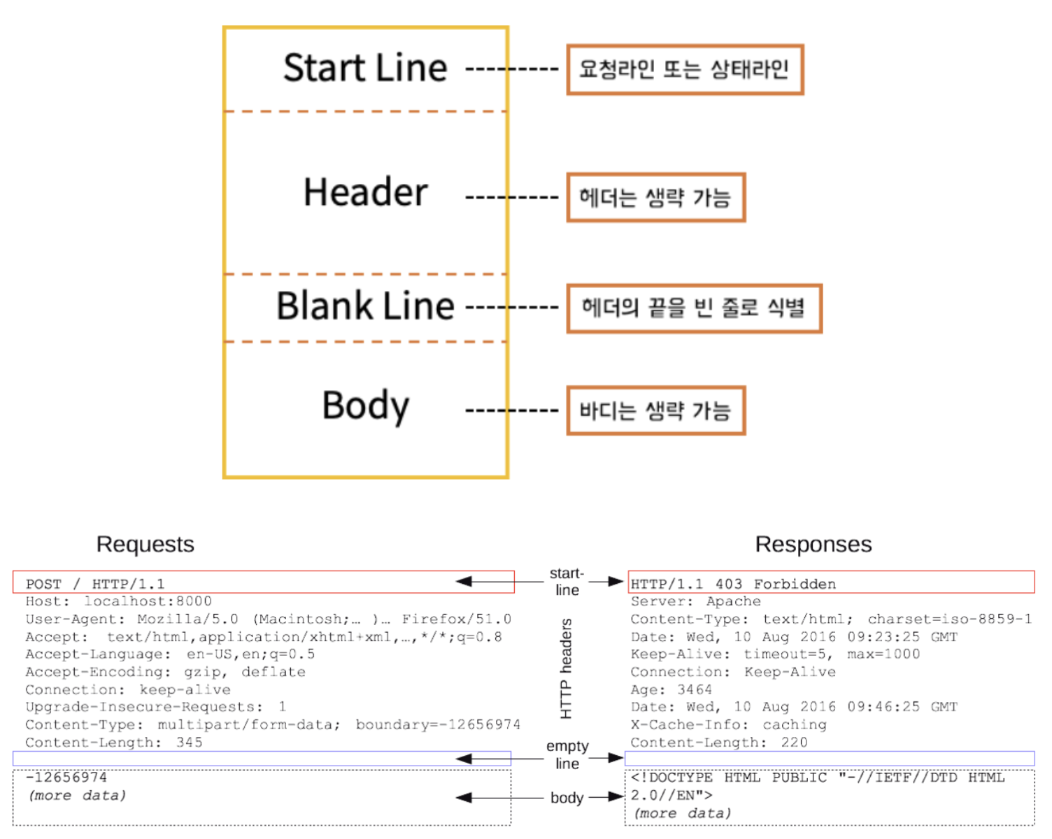 http(request / response)는 기본적으로 blank line을 제외한 세부분으로 구성되어있습니다. Start Line, Header, Body 이렇게 말이죠