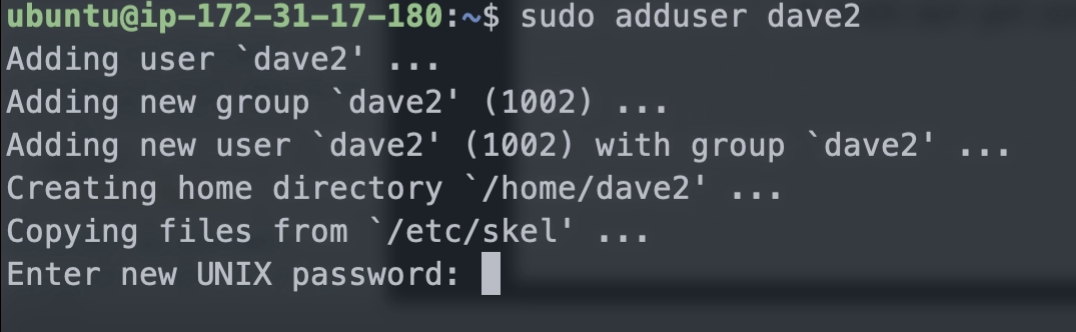 그리고 기본 설정을 자동으로 수행하는 adduser를 입력해보세요 한번