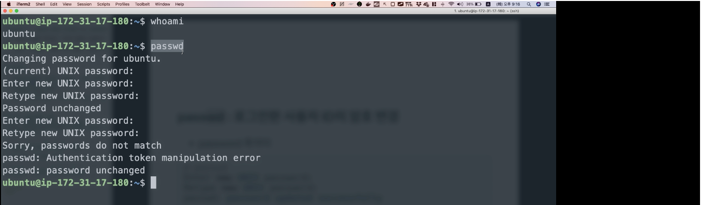 그래서 여러분이 passwd를 입력한다고 해서 아래와같은 화면이 똑같이 나오지 않을 수 있습니다.