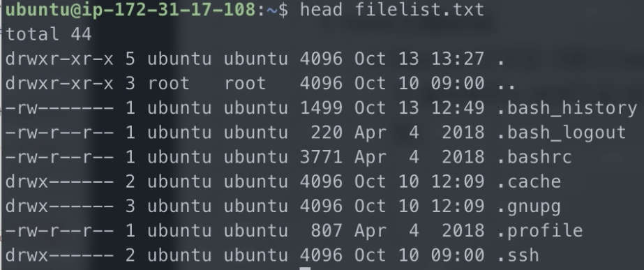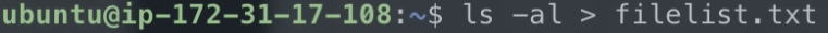 여기에서 ls -al > filelist.txt 를 다시 입력해봤습니다.