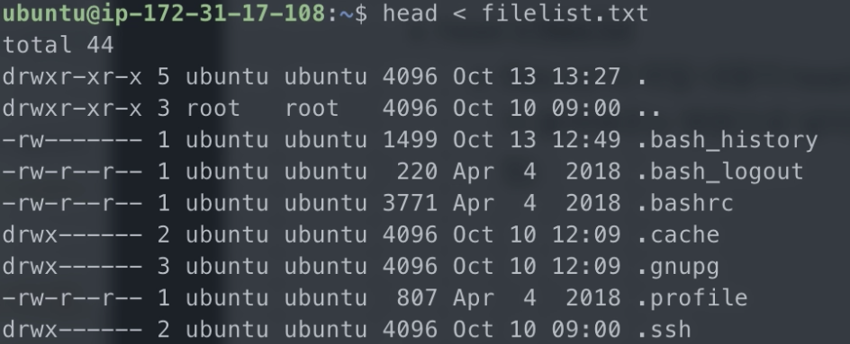 1. files.txt의 파일 내용이 head라는 파일의 처음부터 10라인까지 출력해주는 명령으로 넣어짐(files.txt의 앞 10라인이 출력됨)