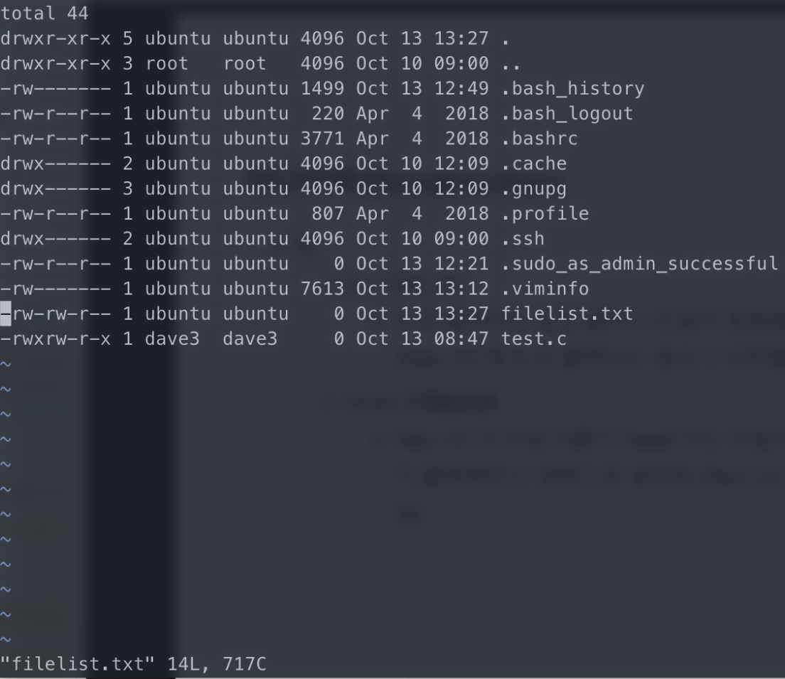 아하. 그럼 이렇게 filelist.txt안에 ls -al의 내용이 저장된걸 확인해볼 수 있네요