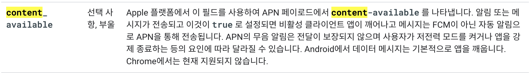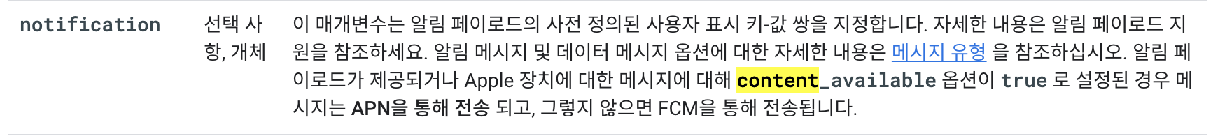 - content_available 옵션이 true로 설정된 경우 메시지는 APN을 통해 전송되고, 그렇지 않으면 FCM을 통해서 전송된다.