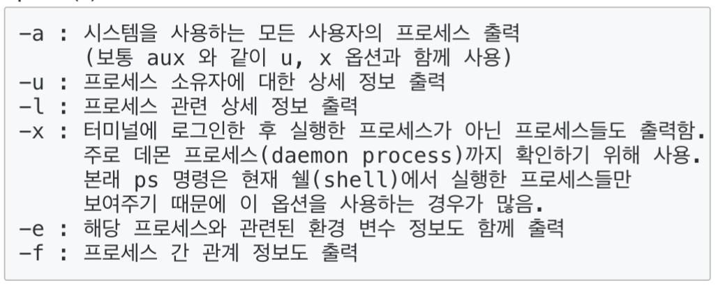 - 데몬 프로세스(daemon process): daemon은 악마를 의미함. 사용자 모르게 시스템 관리를 위해 실행되는 프로세스로 보통 시스템이 부팅될 때 자동실행(예: ftpd, inetd 등)