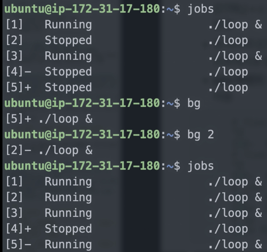 2) 맨 마지막 [CTRL] +z로 중지된 프로세스는 bg명령으로 background프로세스로 실행될 수 있음