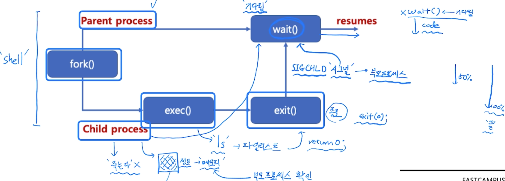 fork와 exec가 순차적으로 실행이 되서 자식 프로세스가 생성이 된다.