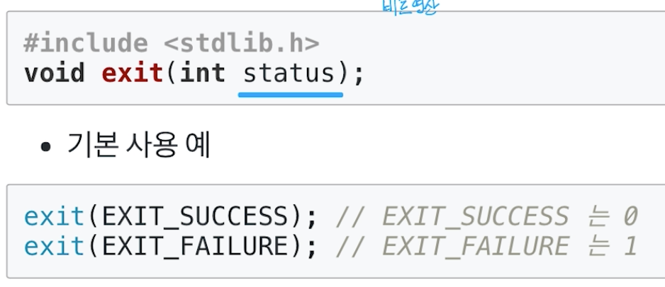 * exit() 함수 : 즉시 프로세스를 종료함 (exit() 함수 다음에 있는 코드는 실행되지 않음)