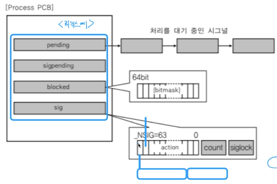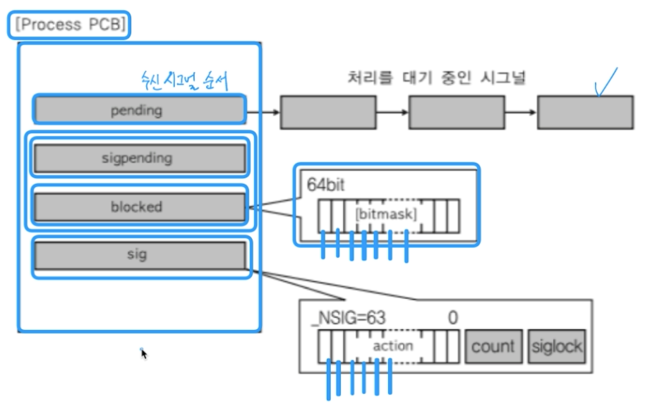 2) sigpending : blocked된 시그널이 뭔지 관리하는 자료구조이다.