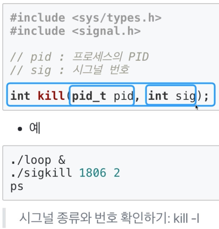해당 프로세스에 특정 시그널을 보낼때 이러한 시스템콜을 사용할 수 있다.