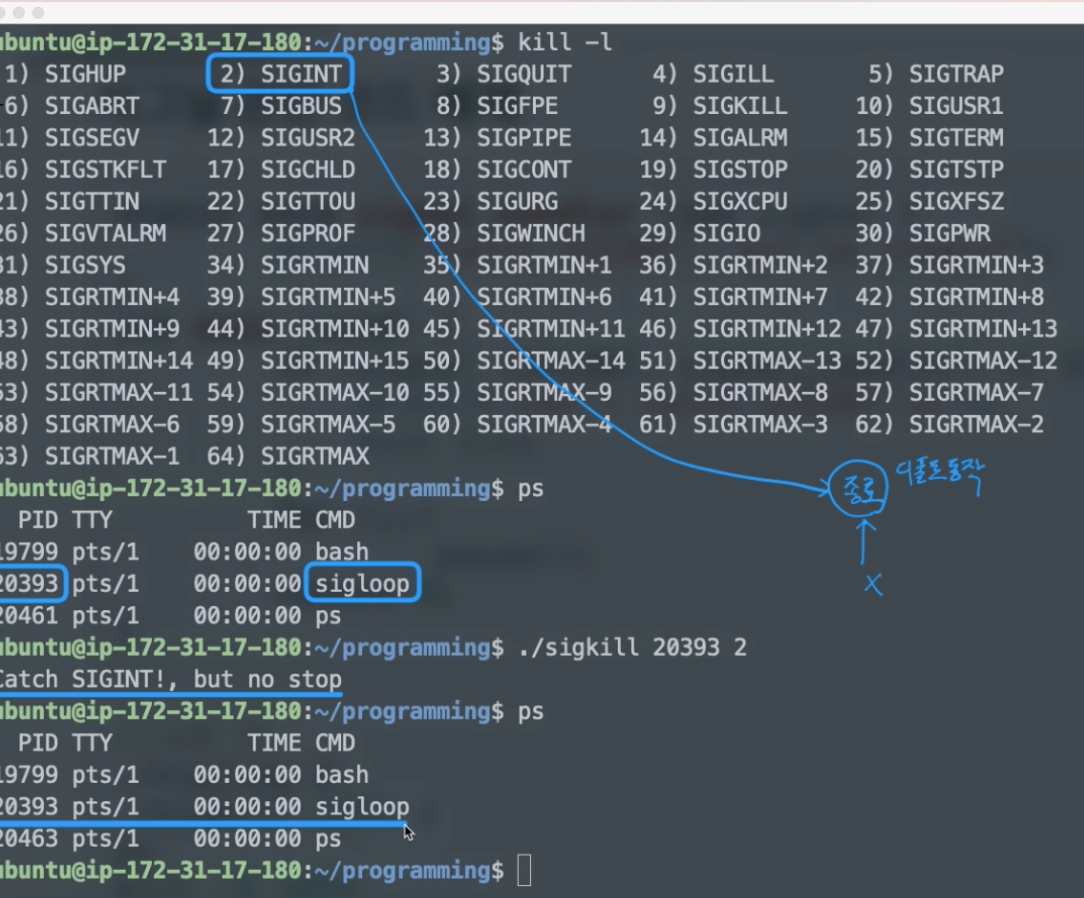 이와 같은 방식으로 시그널이 프로세스와 커널모드와 관련을 지어서 실행이 됩니다.