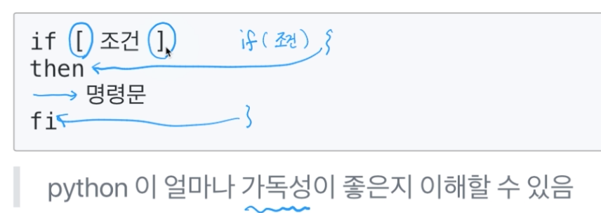 명령문을 꼭 탭으로 씌워야 하는것은 아님.(then과 pi안에만 들어가 있으면 됌)