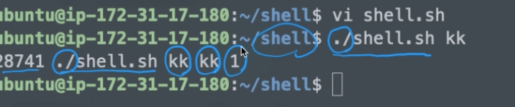 쉘 프로세스 번호, 쉘 스크립트 이름, 명령줄 인수, 모든 명령줄 인수리스트, 인수 개수 출력해보기