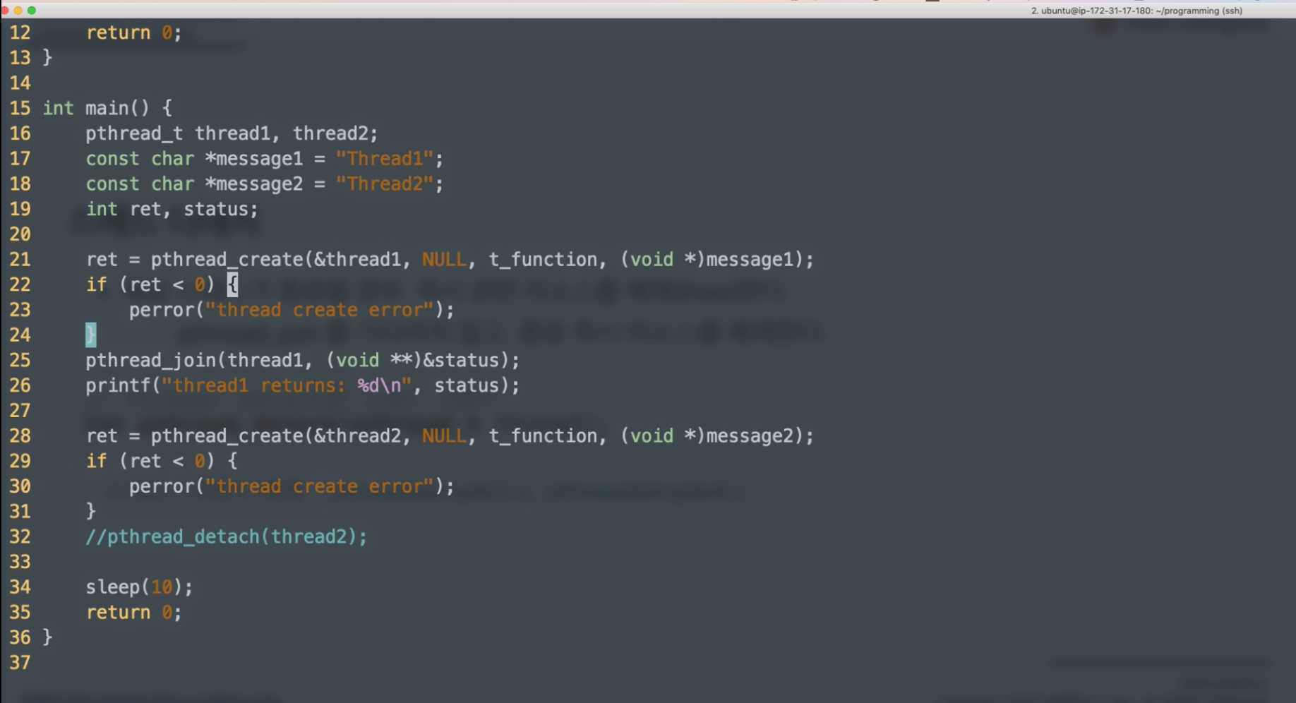 pthread_detach스레드 디태치 : thread1이 종료될때까지 기다리지 않음. 호출하고 막바로 다음코드를 실행해준다.