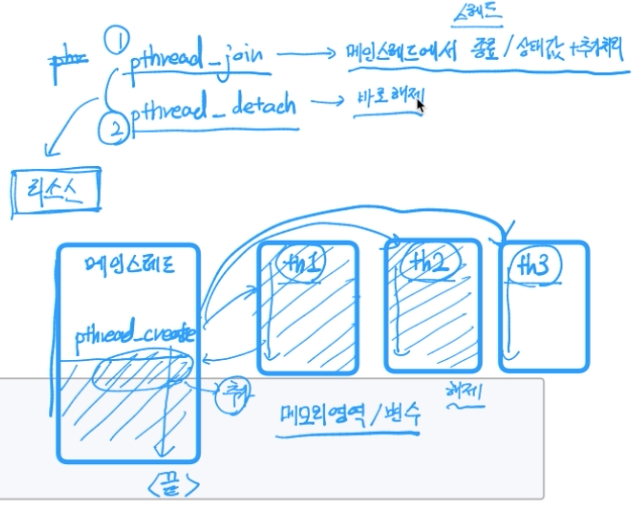 pthread_join스레드조인 : 해당 스레드가 종료하면 해당스레드에 대해 자원도 없어짐. 해당 스레드의 종료 상태값을 가지고 추가 처리 가능.