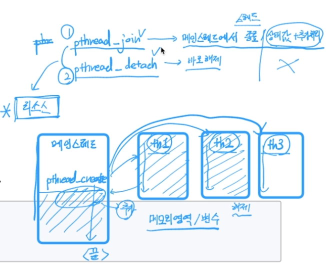 pthread_detach스레드 디태치 : 그 스레드가 종료되면 해당 스레드가 점유하고 있는 리소스를 막바로 없애줘 하면 쓴다.